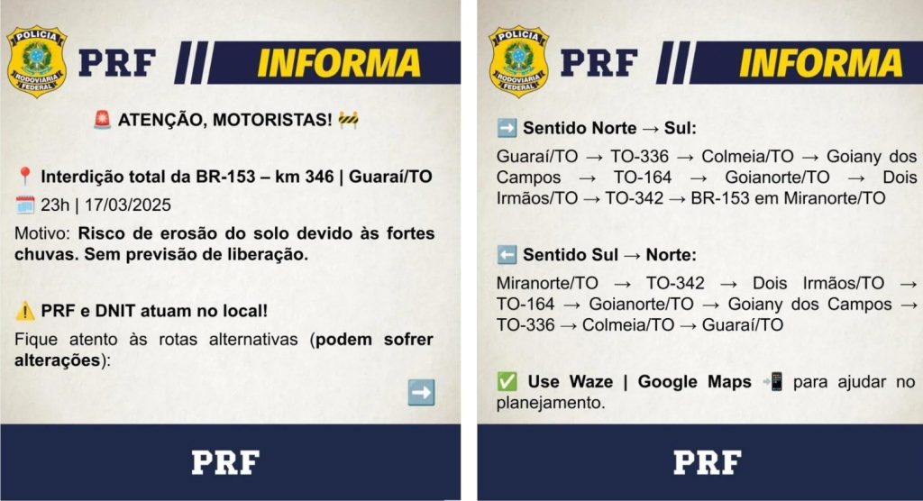 O problema apareceu no km 346 da rodovia, no trevo que dá acesso à Pedro Afonso, na noite de segunda-feira (17). De acordo com a Prefeitura de Guaraí, surgiram fissuras na pista e, inclusive, foram divulgadas opções de desvios para os motoristas que precisassem passar pelo local.